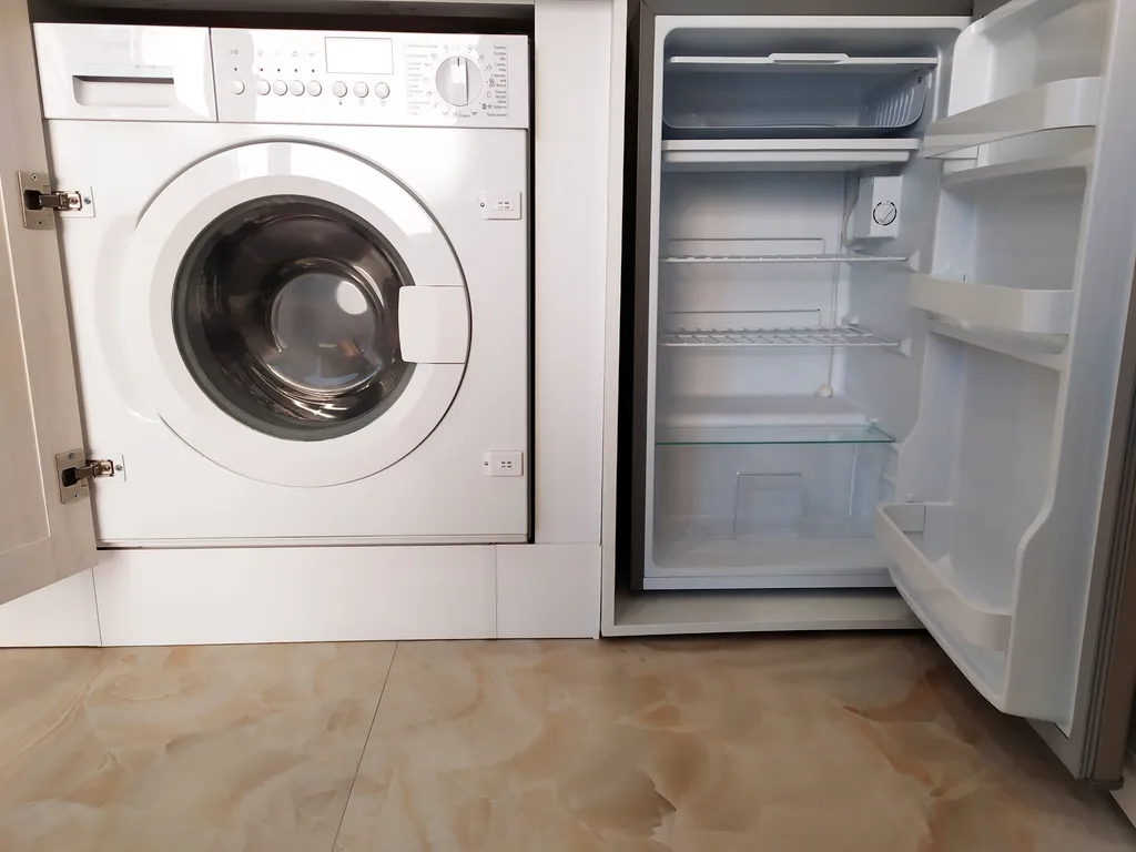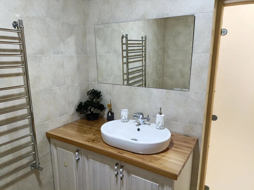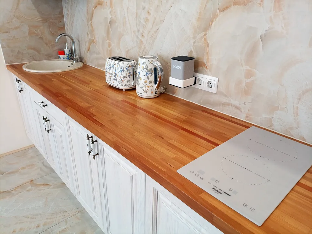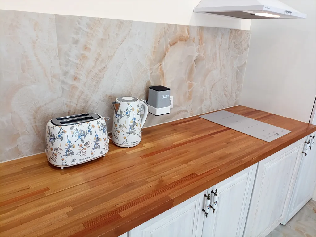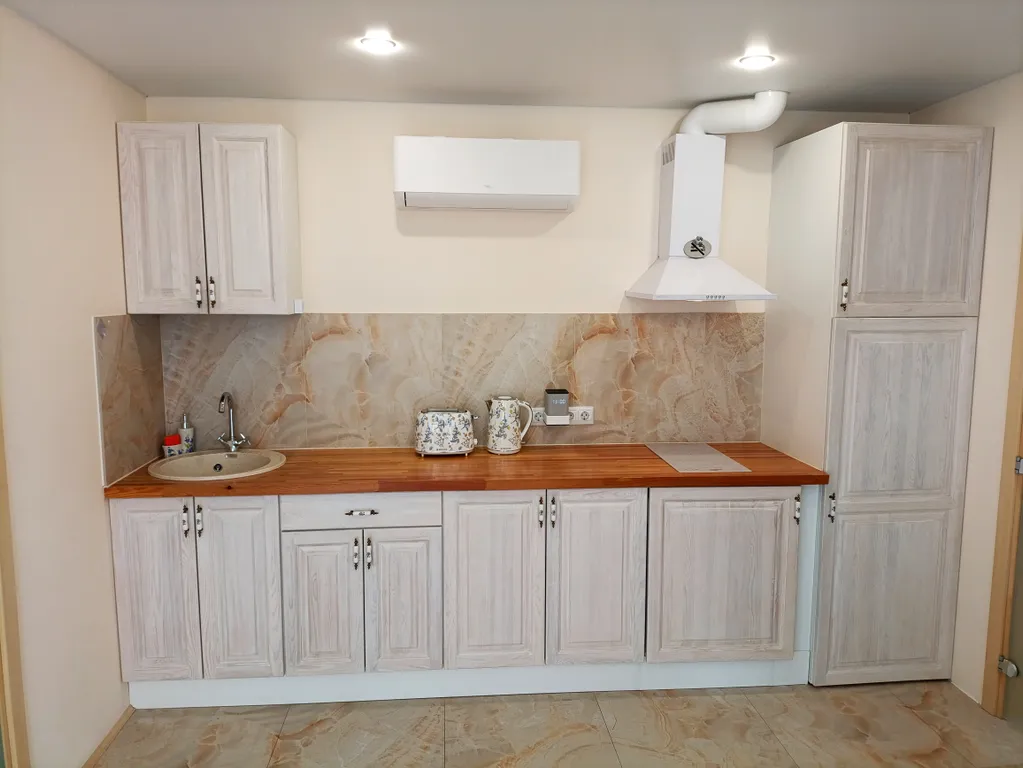 - Кухня - укомплектована современной техникой, индукционная плита, микроволновка, тостер, чайник, стиральная машина, посуда и кухонные принадлежности для сервировки и приготовления пищи.