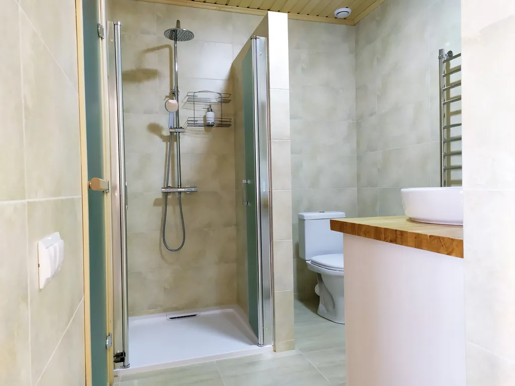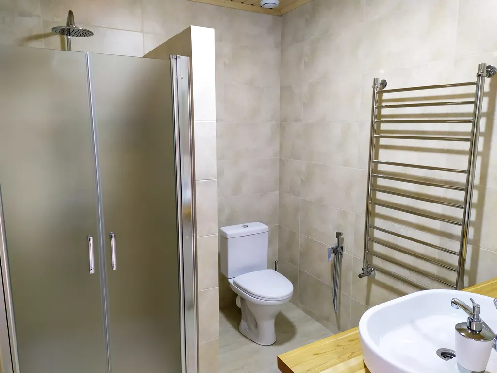 - В ванной комнате: Душевая кабина с тропическим душем, гигиенический душ, фен, тапочки, полотенца и средства личной гигиены.